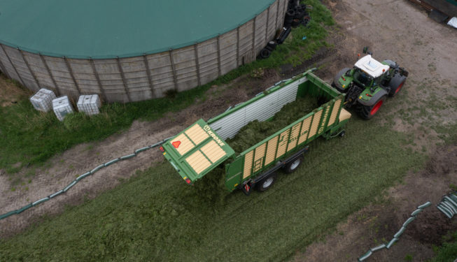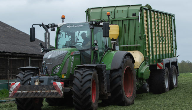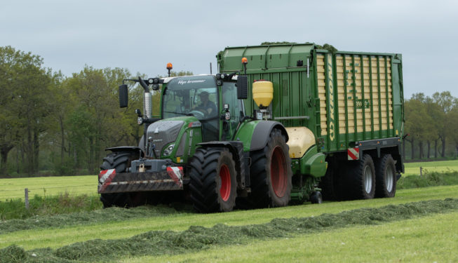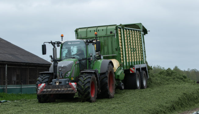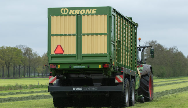 1e Grassnede 2021 Het oprapen van de eerste snede gras werd gedaan met de Krone ZX 450 GL opraapwagen met 8-wielige DWM tandem onderstel. Hiervoor stond de Fendt 718 Profi Plus. Het verdelen en aanrijden van het gras op de bult werd gedaan met de New Holland